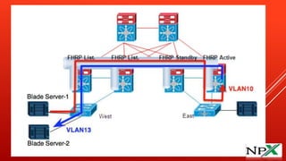 This document discusses Cisco OTV (Overlay Transport Virtualization) and how it separates STP domains between sites, allows different STP technologies per site, handles multi-homing between sites using an Authoritative Edge Device (AED) to prevent loops, and optimizes the forwarding of different traffic types including unicast, multicast, broadcast, and ARP packets between sites while supporting MAC mobility. It also discusses how OTV isolates FHRP protocols between sites.