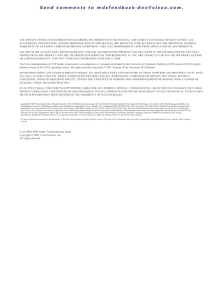 This document provides guidance for troubleshooting issues that may occur when deploying a storage area network (SAN) using Cisco MDS 9000 Family switches. It covers basic troubleshooting methodology and tools, troubleshooting issues for a single switch or between switches, fabric-level issues, and IP storage troubleshooting. The document is organized into chapters covering an overview, switch hardware and booting problems, switch and interswitch connectivity, fabric-level issues, IP storage issues, troubleshooting the fabric, and Fabric Manager issues.