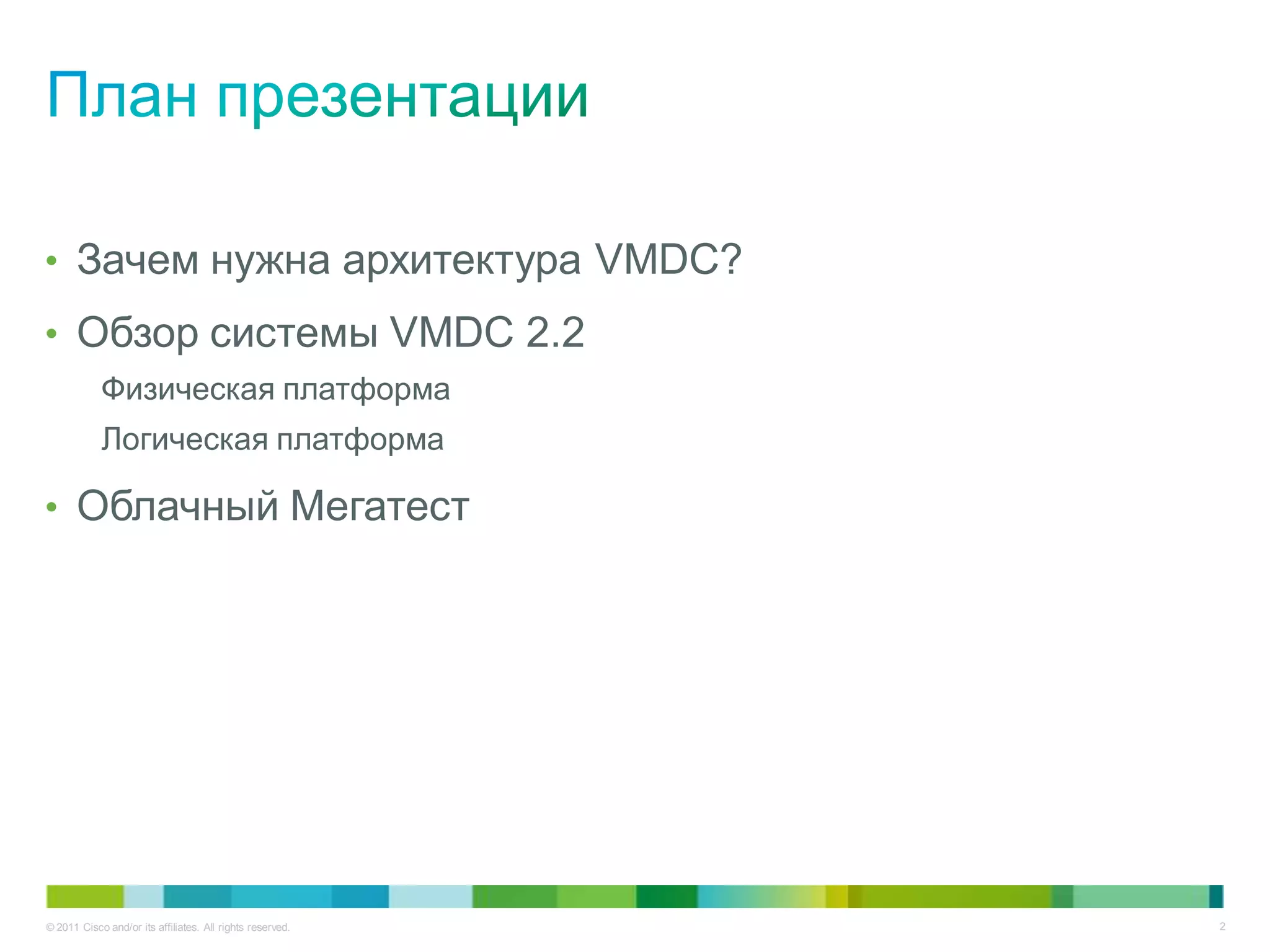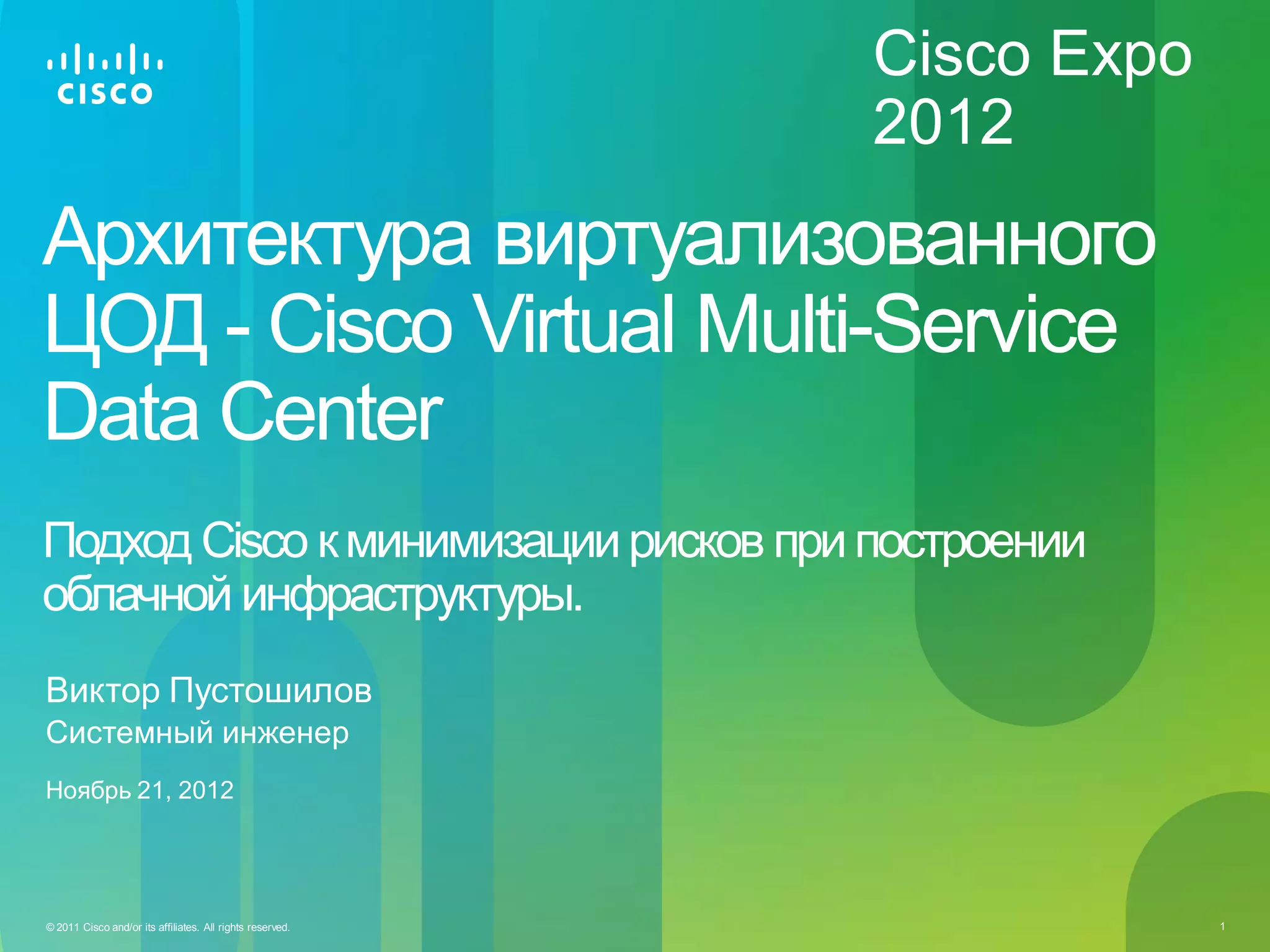 Документ описывает архитектуру виртуализованного центра обработки данных (ЦОД) Cisco и подход к минимизации рисков при создании облачной инфраструктуры. Он включает обзор физической и логической платформы, преимущества виртуализации, автоматизации и унификации, а также различные модели облачных услуг. Также рассматриваются возможности масштабирования, управления безопасностью и поддержки гибридных облаков, что делает решение Cisco V MDC универсальным для различных сервисов и реализаций.
