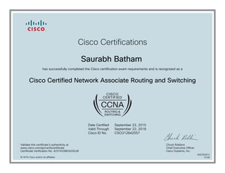 Saurabh Batham has earned the Cisco Certified Network Associate Routing and Switching certification by successfully completing the exam requirements. The certificate is valid through September 22, 2018 and can be verified online with the provided certificate number and verification code. The certificate is signed by Chuck Robbins, CEO of Cisco Systems.