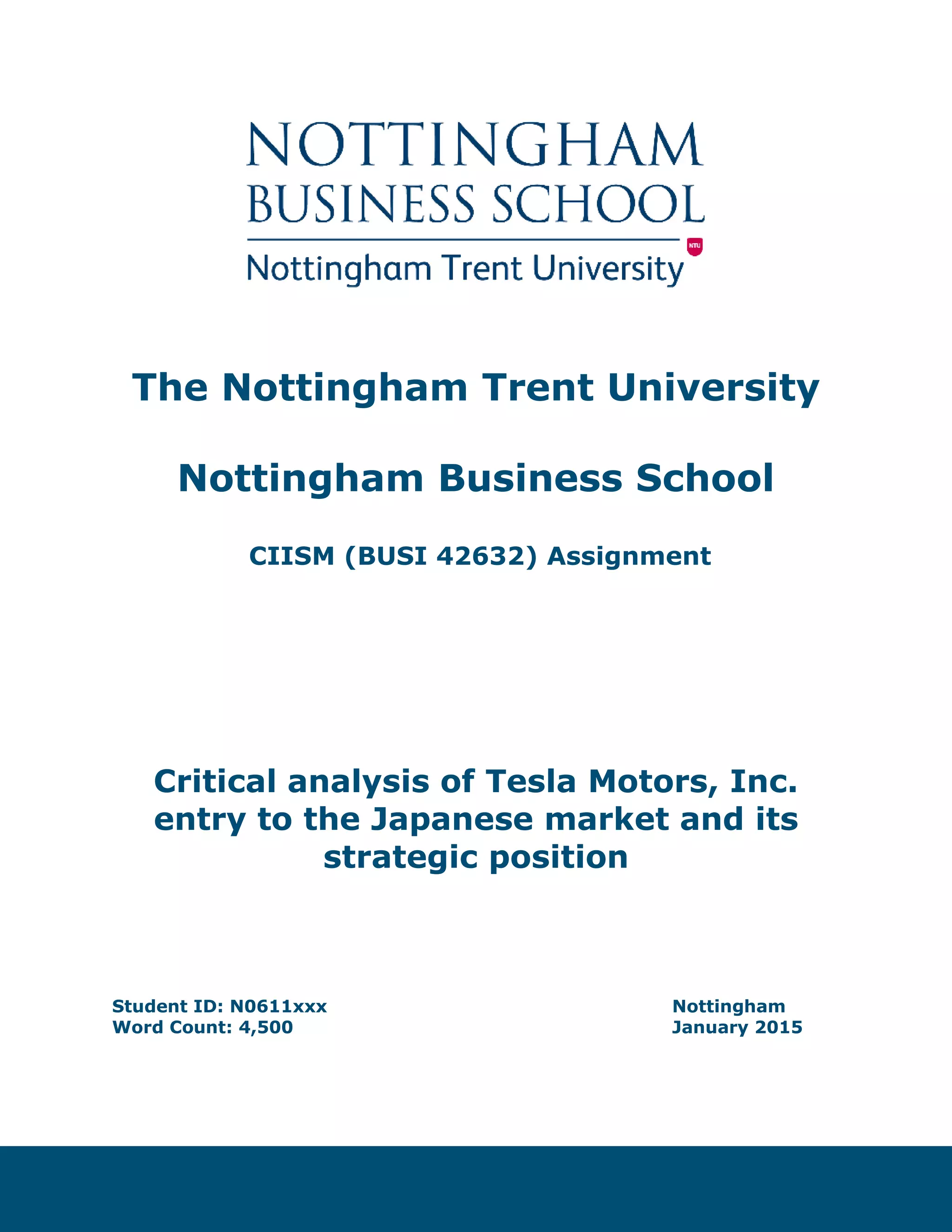 This document provides a critical analysis of Tesla Motors' entry into the Japanese electric vehicle market. It begins with an executive summary and then covers Tesla as a company through its history, corporate strategy including a 2014 patent giveaway, strategic marketing plan, and SWOT analysis. It also analyzes the electric vehicle environment in Japan and considers macroeconomic, microeconomic, and key success factors. The document evaluates Tesla's entry strategy and concludes with key findings that the Japanese market represents an opportunity for Tesla, though established Japanese automakers may increase competition as they devote more resources to electric vehicles.