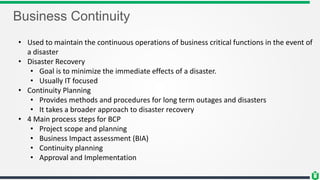 This document discusses business continuity planning (BCP). It outlines the key steps in developing an effective BCP, including: project scope and planning, business impact assessment, continuity planning, and approval/implementation. The project scope and planning phase involves analyzing the business organization, selecting a BCP team, assessing resource needs, and analyzing legal requirements. The business impact assessment identifies critical business functions, resources they depend on, risks/vulnerabilities, and calculates downtime tolerances. Continuity planning develops strategies to address identified risks and minimize their impact. The overall goal is to maintain business operations during a disaster through preparedness and recovery planning.