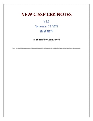 This document provides an overview of key concepts from Domain 1 of the CISSP Common Body of Knowledge (CBK). It discusses confidentiality, integrity, and availability as core security principles, as well as governance, risk management strategies, and developing a complete security program. Specific frameworks, methodologies, and concepts related to risk assessment, security controls, and compliance are also summarized.