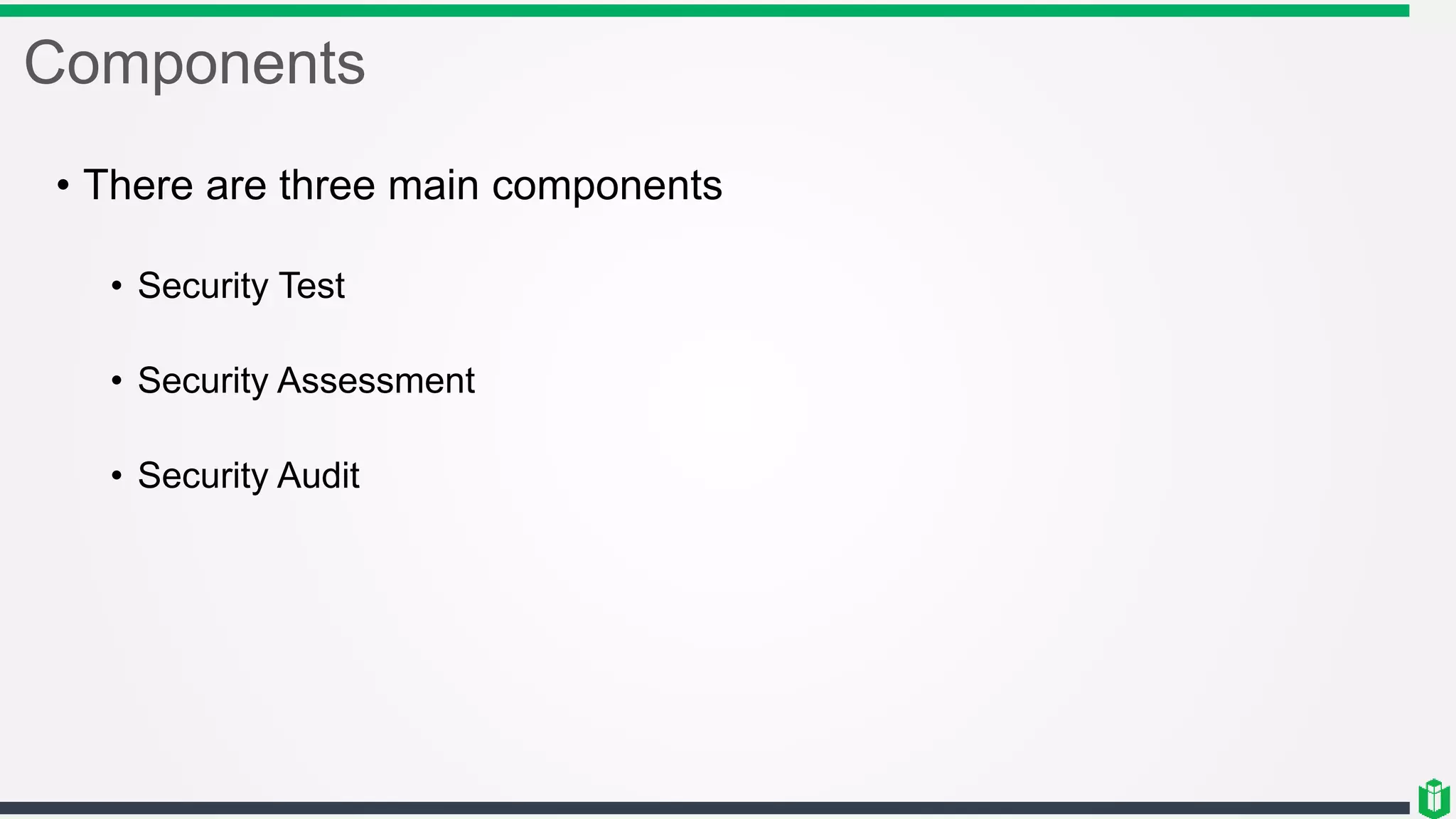 There are three main components of security assessment and testing: security tests, security assessments, and security audits. Security tests verify controls are functioning properly through automated and manual tests. Security assessments perform comprehensive reviews of systems and networks to identify risks and recommend mitigations. Security audits systematically evaluate controls to demonstrate effectiveness to third parties. Other topics covered include penetration testing, vulnerability assessments, code reviews, logging, and different testing methods.