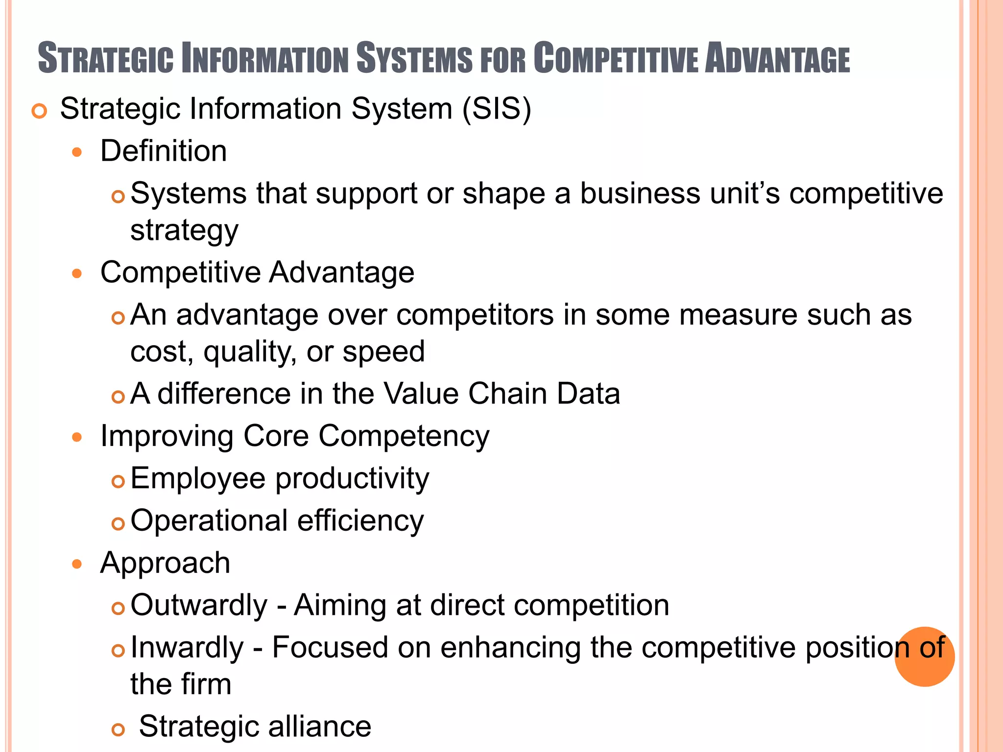 This document discusses strategic information systems and how they can provide competitive advantage. It defines strategic information systems as those that support or shape a business unit's competitive strategy by improving processes, products or relationships to gain an edge over competitors. Porter's value chain and five forces models are presented as frameworks to analyze an organization's strategy and how information systems can positively impact different forces like new entrants, supplier/buyer power, and competition. Specific strategies are listed like differentiation, cost leadership and innovation that can be supported by information technology implementations.