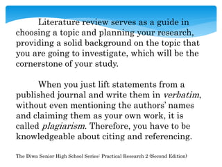 This document discusses proper citation and referencing in academic writing. It explains that citing sources is important to avoid plagiarism and allow readers to locate the original sources. There are different citation styles like APA, MLA, Chicago, and Turabian depending on the academic discipline. In-text citations provide brief source information in the text or after a quote, paraphrase, or summary. The reference list at the end provides full publication details of all cited sources, ordered alphabetically. Proper citation and referencing is important for acknowledging sources, proving the research is evidence-based, and confirming the study's hypotheses.