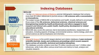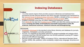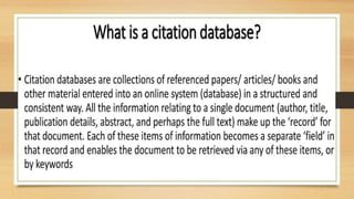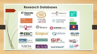 The document explains the concepts of databases and indexing databases, highlighting their purpose in data organization and optimization for efficient access. It also outlines various research metrics used to evaluate performance in the publishing industry, transitioning from traditional measures like the impact factor to a broader range including altmetrics. Key metrics mentioned include SNIP, SJR, IPP, CiteScore, and several author-level metrics such as h-index and g-index.