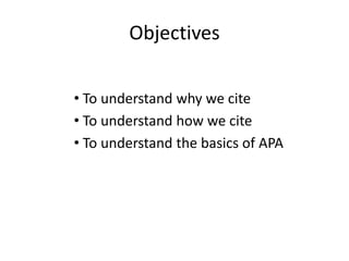 This document provides an overview of citation styles and guidelines, specifically the American Psychological Association (APA) style. It defines what citations are, explains why they are important for avoiding plagiarism and giving credit, and reviews the basic components and format of in-text citations and reference list entries for common sources like journal articles and books based on APA rules. The document encourages following the APA Publication Manual and consulting library resources for accurate citations.
