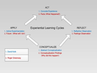 Experiential learning involves gaining knowledge from direct experiences and reflection on those experiences. It can take many forms like internships, apprenticeships, or problem-based learning. Experiential learning theories emphasize the importance of experience in the learning process. Kolb's experiential learning model outlines a cycle of concrete experience, reflective observation, abstract conceptualization, and active experimentation. Learners have different styles that emphasize different parts of this cycle, such as diverging, assimilating, converging, or accommodating styles.