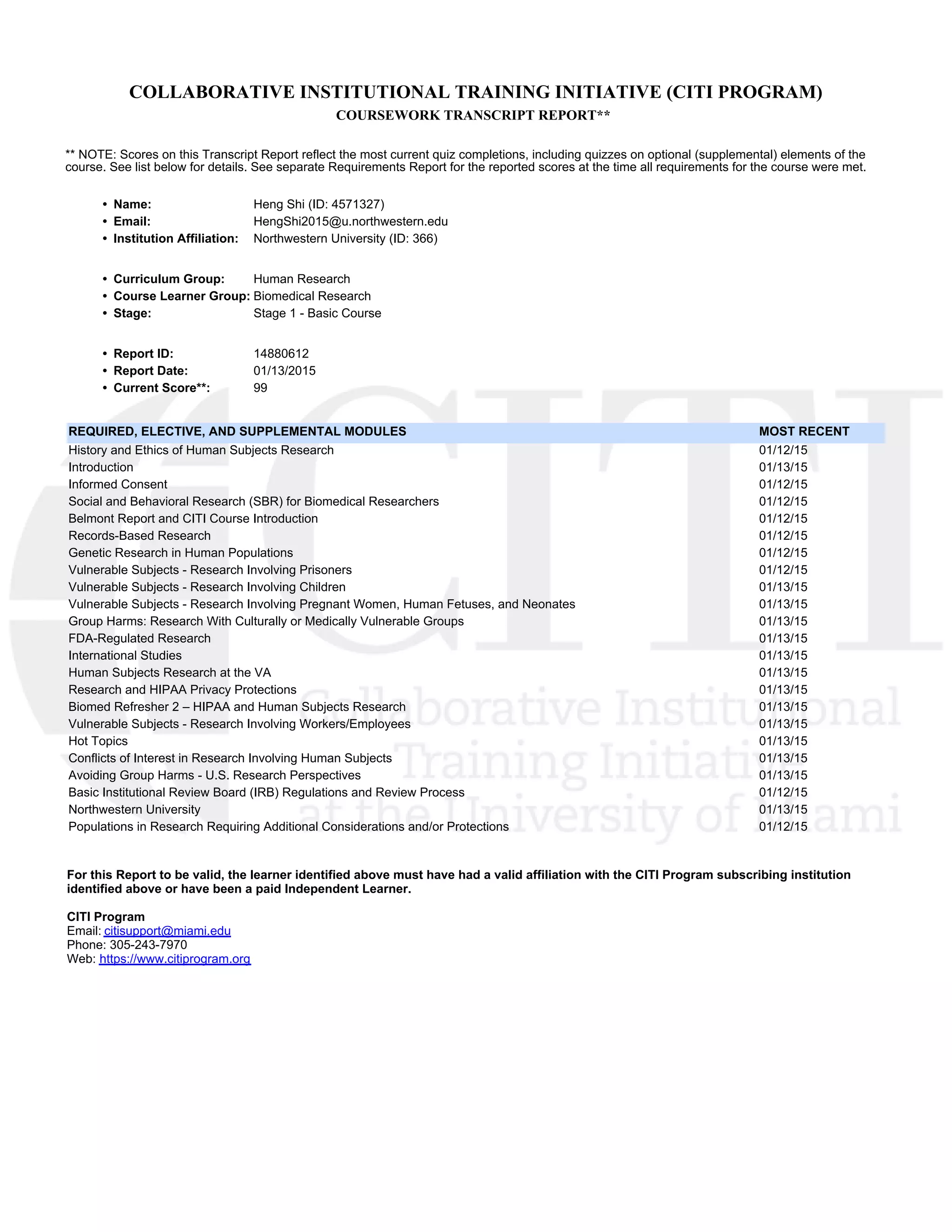 Heng Shi completed training through the CITI Program on human subject research ethics. The report provides details of Shi's training including courses completed, scores, institution affiliation with Northwestern University, and dates of completion between January 12-13, 2015. Shi received a score of 95% on required course elements and 99% when including optional supplemental modules. The report confirms Shi satisfied training requirements for the basic course in human subject research ethics through the CITI Program.