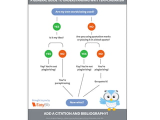 This document provides information on using evidence and citing sources properly. It defines what evidence is, the different types of evidence, and the three main ways to use evidence - quoting, paraphrasing, and citing. It emphasizes the importance of citing sources to avoid plagiarism. It explains what information needs to be cited and how to format in-text citations, parenthetical citations, and create a Works Cited page in MLA style. It also provides examples of how to integrate quotes into writing and addresses special cases like long quotes or quotes within quotes.