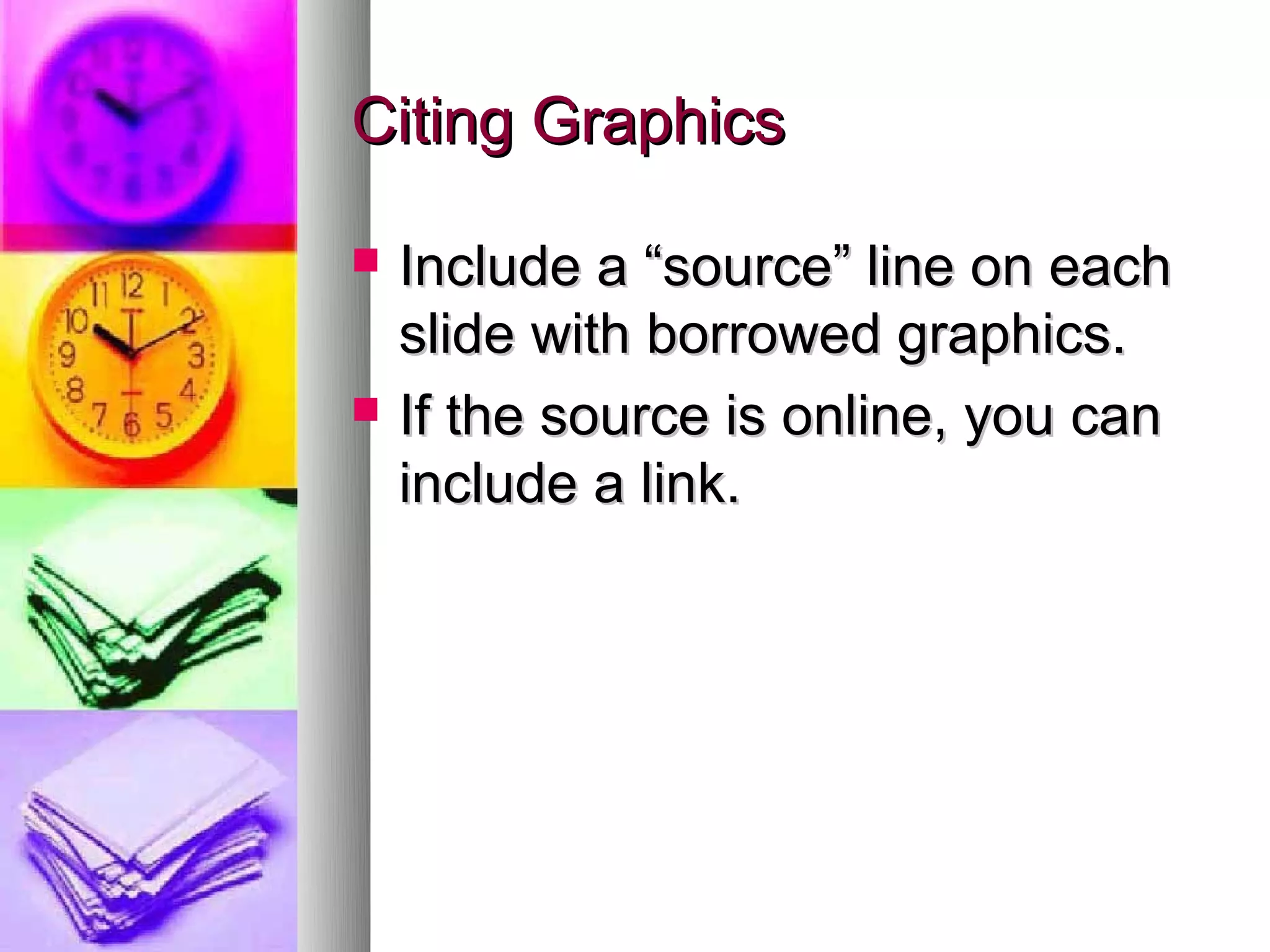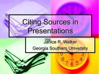 This document provides guidance on how to properly cite sources within presentations. It recommends including a source line on slides with borrowed graphics that cites the original source. For quotes, statistics, or important information from other sources, the source should be cited either in parentheses after the quote or on a source line. A works cited list citing all sources in the required style should be included at the end.