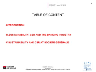 This memo discusses sustainability, corporate social responsibility (CSR), and Société Générale's CSR initiatives. It outlines how CSR involves integrating social and environmental concerns into business operations and stakeholder engagement. For banks, CSR priorities include acting responsibly across all activities, developing socially and environmentally innovative products, implementing sustainable HR policies, partnering with local communities, transparent communication, and reducing environmental impact. Société Générale's CSR focuses on quality, governance, risk management, compliance, and innovation. It aims to align social and environmental concerns with its strategy through a proactive approach considering each region's specifics.