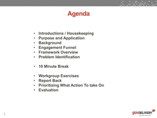 The document outlines a framework for engaging citizens to address community issues through a structured process of discussing, planning, acting, and evaluating. It emphasizes creating a safe environment for communication, understanding underlying problems, and developing measurable action plans. The workshop includes objectives, group exercises, and evaluations to promote effective problem-solving and citizen participation.