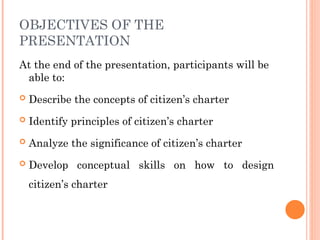 The document outlines the objectives and principles of the Citizen’s Charter (CC), emphasizing its role as a contract between service users and providers to enhance service delivery standards. It highlights the importance of transparency, accountability, and accessibility, along with a structured approach to develop a Citizen’s Charter, which includes stakeholder consultation and grievance redress mechanisms. Additionally, the document identifies conditions for success and characteristics of effective CC implementation, while noting common weaknesses encountered in its application.