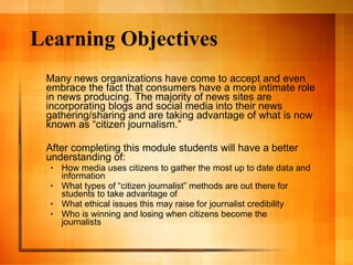 Citizen journalism has become an important part of how news is gathered and shared. Many news organizations now incorporate citizen journalism into their reporting by allowing public uploads of photos, videos and other content to their sites. CNN's iReport program is one example of how a major news network engages citizen journalists. It allows anyone to upload multimedia content for potential inclusion in CNN's news coverage. Supporters see benefits to having more direct reporting from eyewitnesses, while critics argue it can lower journalistic standards and credibility. Most experts argue for a hybrid model where professional and citizen journalism work together collaboratively.