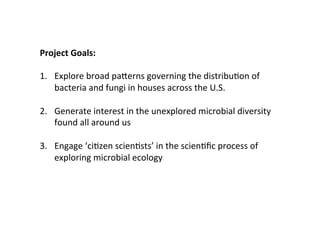 This document describes a citizen science project aimed at exploring the microbial diversity found in homes across the United States. The project is led by researchers from the University of Colorado and NC State University. They have recruited over 6,000 volunteer households to collect samples from various surfaces in their homes that will be sequenced and analyzed to study patterns in the bacteria and fungi present. Their goals are to better understand how indoor and outdoor microbial communities relate and how factors like climate, pets, and house characteristics influence the microbes that live in homes. So far they have conducted a pilot study of 20 homes in North Carolina and are now analyzing samples from over 1,000 homes with plans to expand the study.