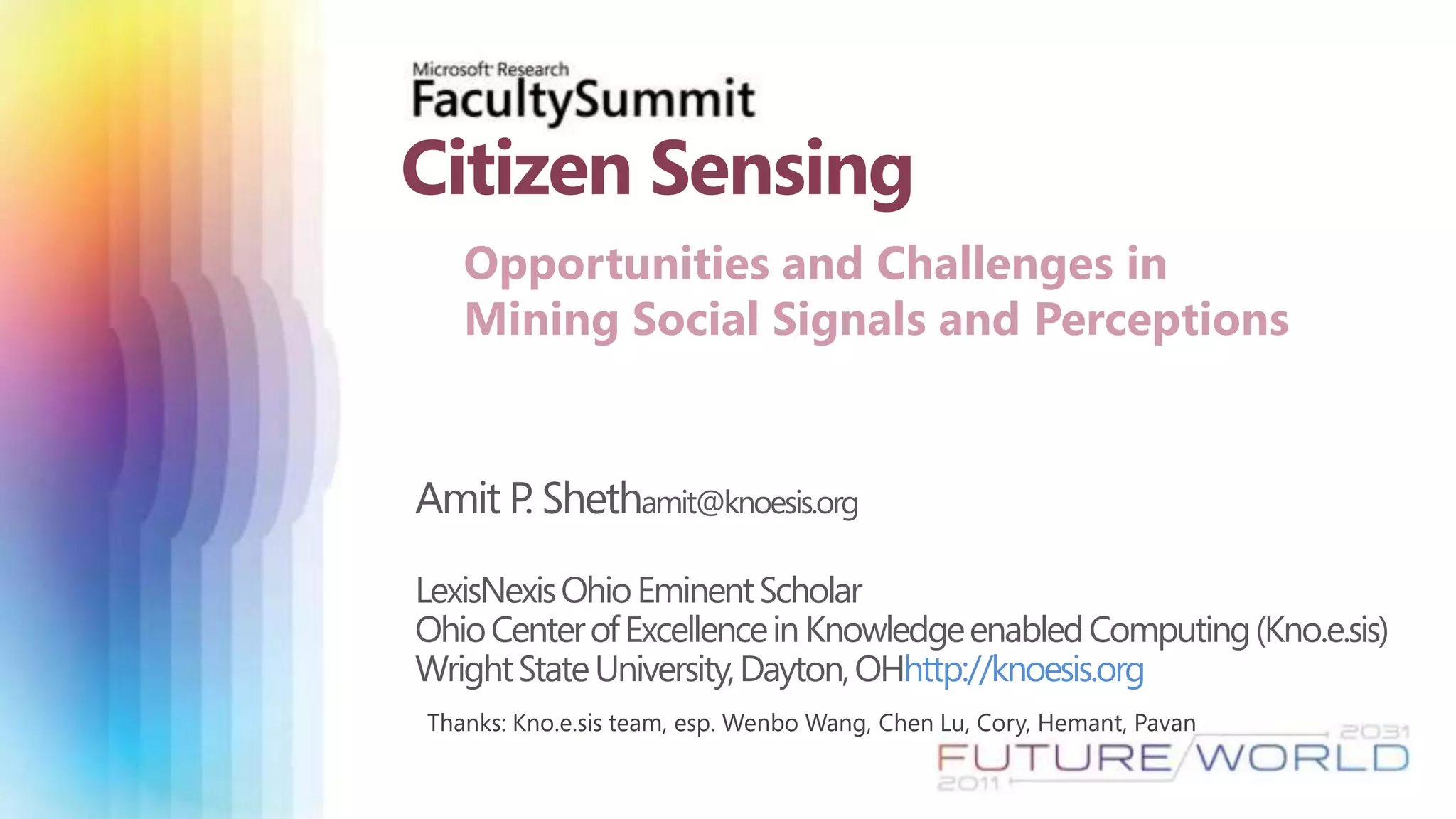 The document discusses the concept of citizen sensing in the context of mining social signals and perceptions, emphasizing the role of semantics in enriching human experience and enabling effective data analysis. It covers various applications, tools, and frameworks developed over the years, including 'Twitris' for analyzing social media data, and highlights the significance of semantic models in processing user-generated content. The findings denote the explosive growth of data and the necessity for semantic scalability to derive meaningful insights for human activities and decision-making.