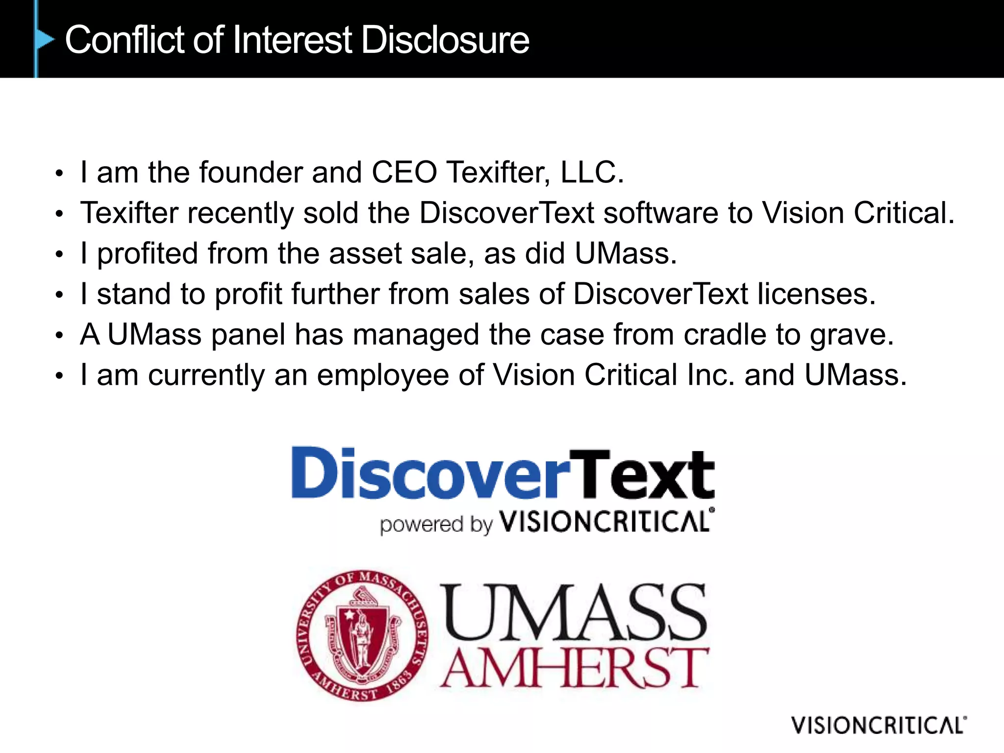 The document details the 'citizen voices' global conference on citizen engagement held on March 17, 2013, organized by Dr. Stuart Shulman. It includes a disclosure of his professional conflicts of interest and outlines his research journey in deliberative democracy, erulemaking, and the evolution of citizen engagement in the digital age. The presentation highlights the importance of citizen voice online while cautioning against over-reliance on automation.