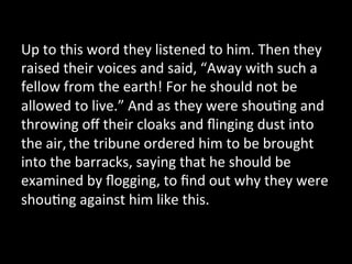The passage describes an interaction between Paul and a Roman tribune. When a crowd was shouting and calling for Paul's death, the tribune had Paul brought in to be flogged to understand why the crowd was shouting against him. However, when Paul revealed he was a Roman citizen, the tribune stopped the interrogation out of fear of violating Paul's rights, as Roman citizens could not be punished without trial.