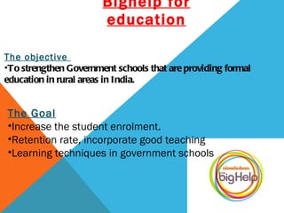 The social entrepreneur group Bighelp aims to strengthen government schools in rural India by increasing student enrollment and retention rates through better teaching methods. They need sponsors to donate $1500 per child to improve schools and provide educational opportunities. Their goal is to make government schools more engaging places for learning and to discover students' talents through a "Talent Test" program.