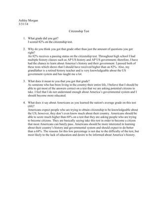 Ashley Morgan scored an 82% on the U.S. citizenship test. While this score is passing, she believes she should have scored higher given her background in history classes in high school and lessons from her retired history teacher grandfather. The 82% score motivated her to want to become more educated about the U.S. governmental system. She also notes that the average score of 68% for Americans on the test suggests U.S. citizens do not know much about their own country and should expect to score higher, rather than using the test as a benchmark for what is required to become a citizen.