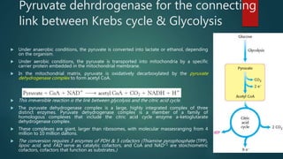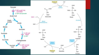 The document summarizes the key steps in the citric acid cycle. It begins by explaining how pyruvate is converted to acetyl-CoA by the pyruvate dehydrogenase complex, providing the link between glycolysis and the citric acid cycle. It then outlines the six steps of the citric acid cycle, including the condensation of acetyl-CoA and oxaloacetate to form citrate, and the subsequent oxidation and decarboxylation reactions that generate NADH and FADH2 and regenerate oxaloacetate to restart the cycle.
