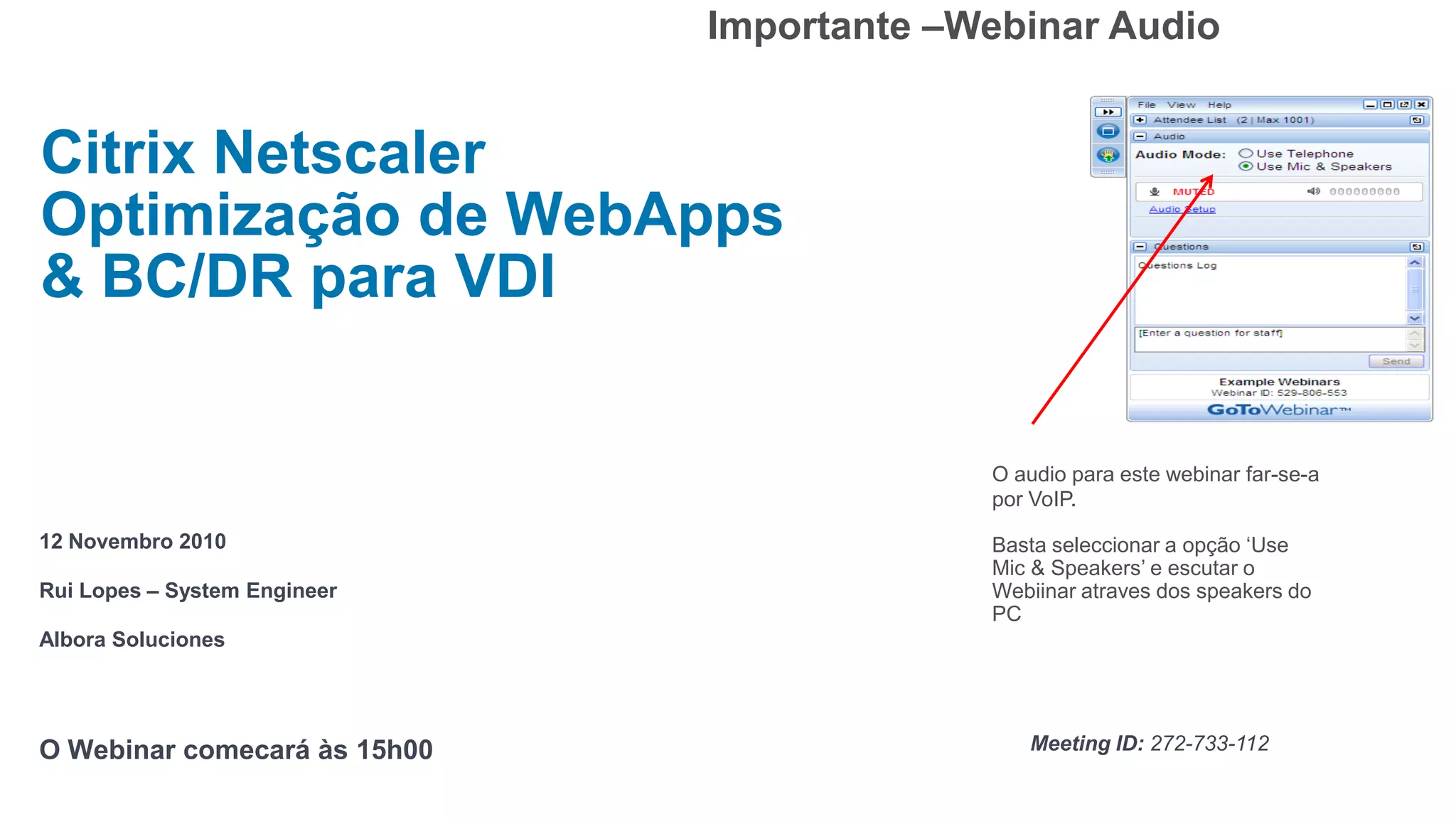 The document announces a webinar on Citrix NetScaler focusing on web application optimization and disaster recovery for VDI, scheduled for November 12, 2010. It highlights the benefits of using NetScaler, including improved application performance, reduced server loads, and enhanced security against web threats. Additionally, it outlines various features and capabilities of NetScaler to maximize application availability and streamline management across multiple environments.