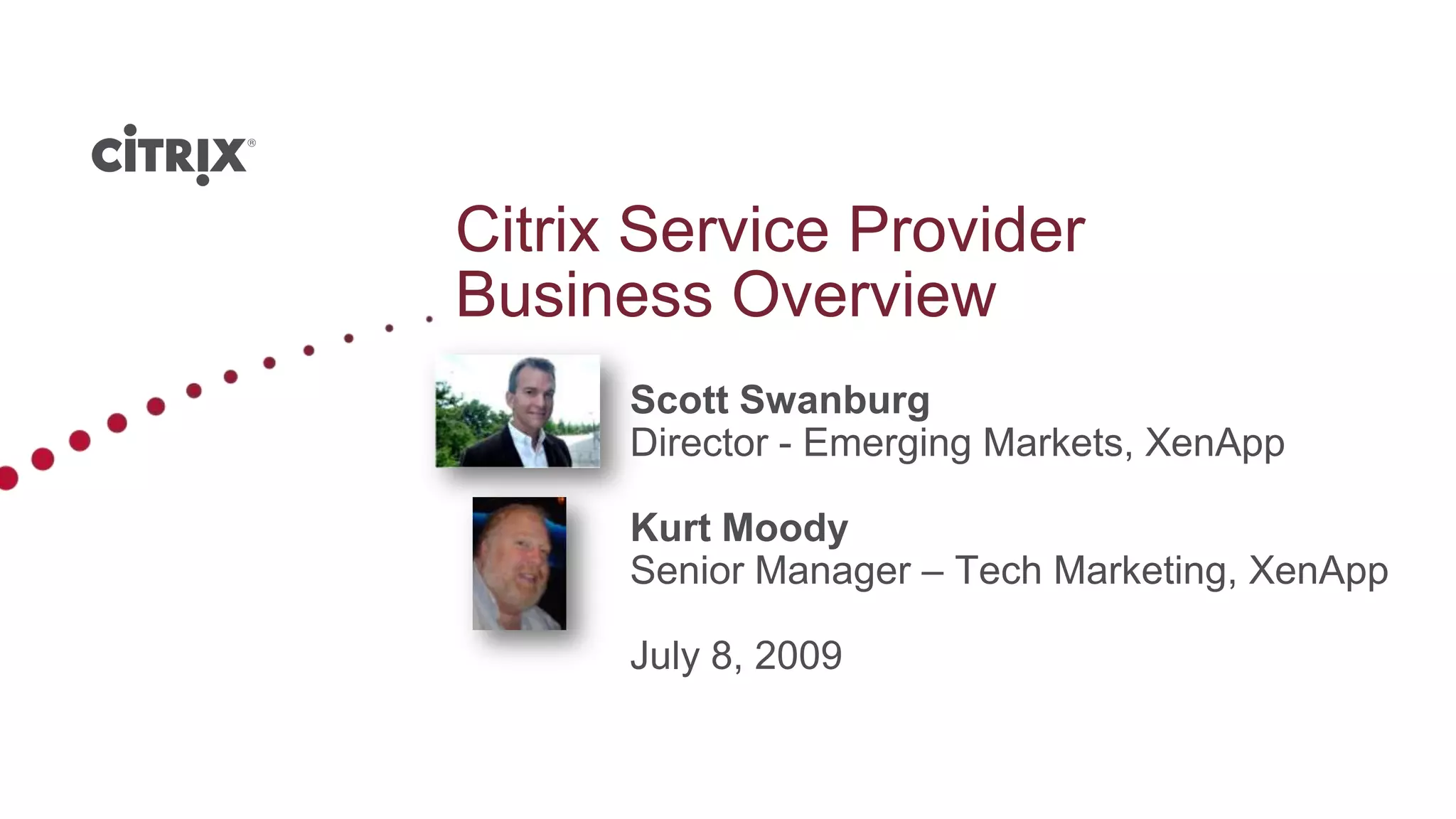 This document provides an overview of the Citrix Service Provider program for hosting Windows applications. It discusses the target market of SMBs with 10-250 employees and limited IT staff. It estimates the worldwide SMB market at 1.9 million firms and projects near-term revenue opportunity from subscriptions. It promotes Citrix XenApp and XenServer for application and desktop hosting and the benefits of the Citrix-Microsoft partnership. The presentation demonstrates the Citrix Service Provider platform and outlines next steps for partners to stay current, go live, get trained, sign up, and connect.