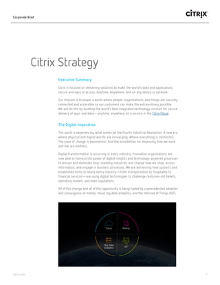 Citrix aims to securely deliver applications and data anytime, anywhere by building the world's best integrated technology services. It will focus on becoming the leader in Workspace as a Service by delivering a comprehensive and integrated platform through the Citrix Cloud. Citrix will also reinforce its leadership in application delivery, virtualization, and mobility while gaining a leadership position in secure network delivery solutions. Additionally, Citrix seeks to become the preferred solution for Enterprise File Synchronization and Sharing.