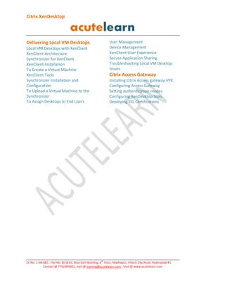 The document provides an overview of Citrix XenDesktop, detailing its components, architecture, and desktop virtualization models. It covers installation and configuration, licensing, Active Directory considerations, and user management. Additionally, it includes information about troubleshooting, application delivery methods, and the use of Citrix Access Gateway for secure connections.