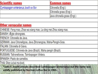 The document provides an overview of citronella (Cymbopogon winterianus), detailing its cultivation across various Indian states, including its high-yielding varieties. It discusses the plant's botany, essential oil composition, therapeutic properties, propagation methods, soil requirements, and cultivation techniques, emphasizing the optimal planting season and fertilization needs. Finally, it outlines harvesting practices, potential diseases, pest control, and expected yields, highlighting the economic benefits of citronella cultivation.
