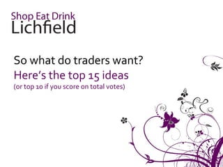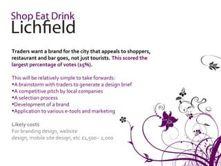 Traders in Lichfield have prioritized branding for the city, a town centre manager, and a local website as essential improvements to attract more visitors and support local businesses. Additional suggestions include seasonal events, improved communication, and enhanced marketing efforts, with specific costs and considerations outlined for each idea. The findings aim to foster a stronger local economy by better engaging both traders and residents in promoting the city.