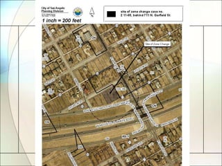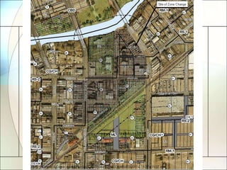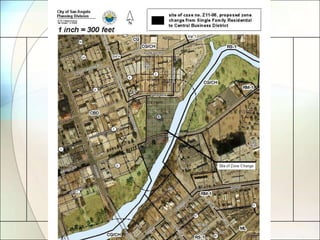 The document discusses three requests for zone changes brought before the City Council. The first requests changing three vacant lots from Single-Family Residence to Neighborhood Commercial to match the zoning of neighboring businesses. The second requests changing part of two parks from Single-Family Residence to Central Business to better align the zoning boundary with the river. The third requests changing a mix of commercial and manufacturing zones to Central Business to expand the downtown area as suggested in the Comprehensive Plan. City staff and the Planning Commission recommend approving all three requests.