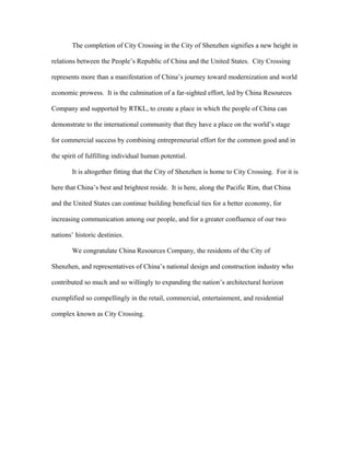 City Crossing in Shenzhen represents growing economic ties between China and the US. The development was led by China Resources Company to create a place for China to demonstrate commercial success by entrepreneurship that benefits society. City Crossing signifies China's modernization and growing global influence. It is fittingly located in Shenzhen, home to China's top talent, where continued cooperation between China and the US can strengthen both economies and cultural understanding.