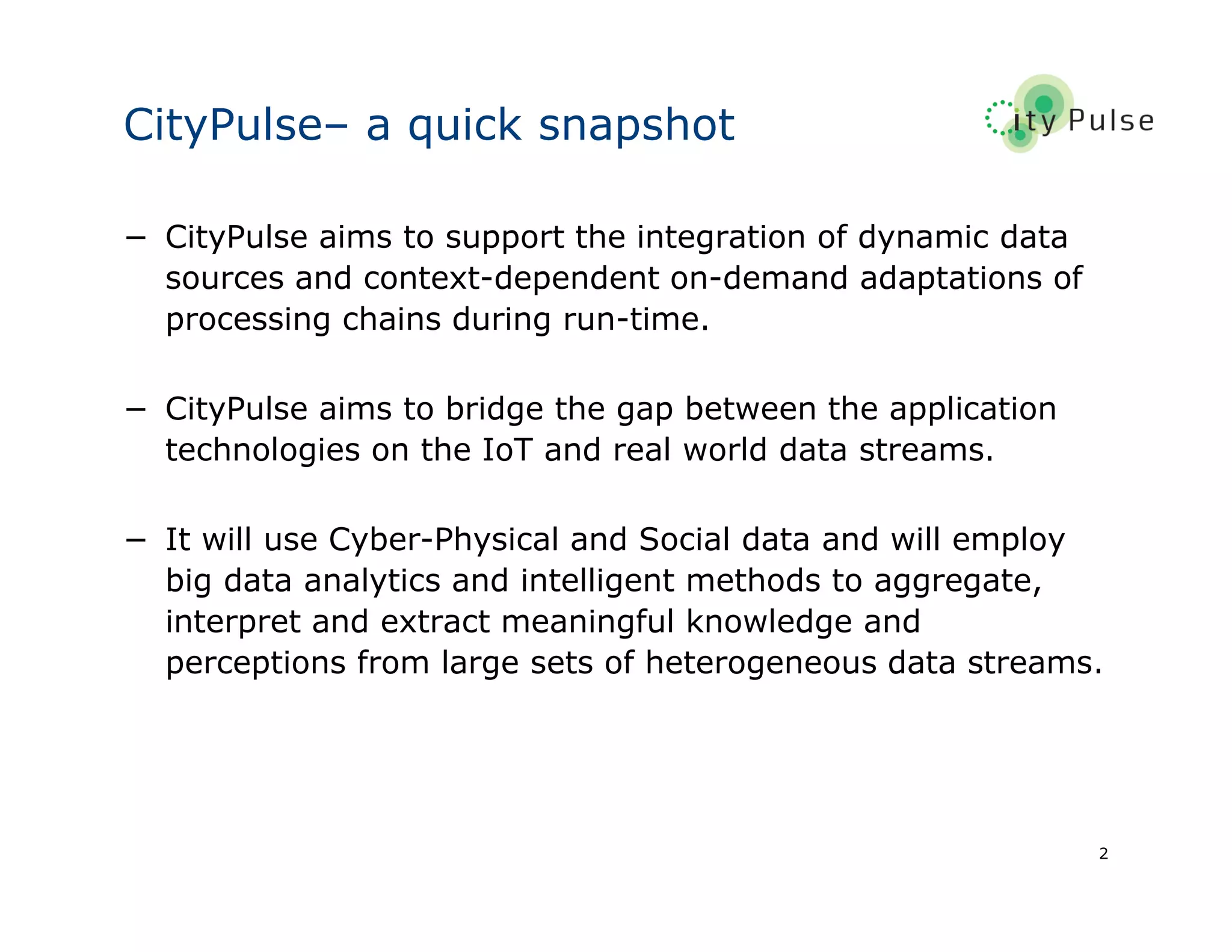 CityPulse is a project that aims to develop a distributed framework for processing large-scale real-time IoT and social data streams to extract knowledge for smart city applications. The framework will semantically integrate heterogeneous data sources, perform large-scale analytics, and adapt processing in real-time based on context. It will be tested through prototype smart city applications to evaluate its ability to support future smart city platforms and products. The key issues addressed are virtualization of data, on-demand federation of sources, large-scale aggregation and analytics, real-time interpretation and processing control, and reliable information extraction.