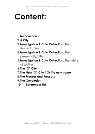 The document is a report on a future city project. It provides background on ancient, present and future cities as research for a new envisioned city called New Indron City. It discusses the history and elements of Baghdad, Tulsa and future underwater condos that will influence the design of New Indron City. The report also outlines the destruction of the original Indron Island city and the religious diversity of its population.