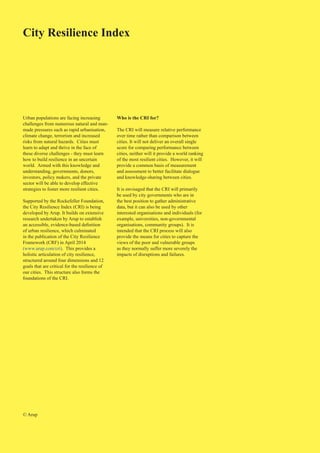 The City Resilience Index (CRI), supported by the Rockefeller Foundation and developed by Arup, provides a framework for cities to assess and improve their resilience against various challenges like climate change and urbanization. It is structured around four dimensions—health and well-being, economy and society, infrastructure and environment, and leadership and strategy—comprising 12 goals and 52 indicators that guide cities in fostering resilience. The CRI is designed for city governments and other stakeholders to evaluate their own performance over time without ranking cities against each other.
