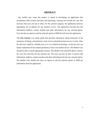 The document describes a mobile application called City Search that allows users to search for activities and businesses in different cities and categories. The application will retrieve location options and provide full contact details for any selected option. The mobile user should be able to search cities, view categories and locations, select options, and call or SMS options from the application.