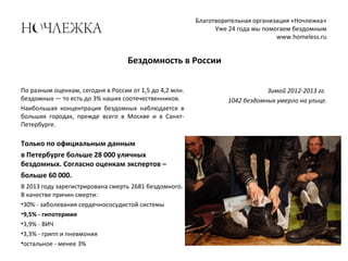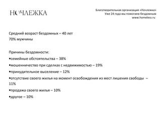 Благотворительная организация «Ночлежка» на протяжении 24 лет помогает бездомным в России, где их количество варьируется от 1,5 до 4,2 миллиона. В Санкт-Петербурге, по официальным данным, насчитывается более 28,000 уличных бездомных, а причины бездомности варьируются от семейных обстоятельств до мошенничества с недвижимостью. Организация предлагает разнообразные услуги, включая пункты обогрева и консультации, а также активно работает над улучшением своих онлайн-платформ.