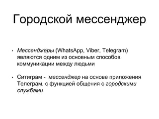 Ситиграм — это городской мессенджер на основе Telegram, который позволяет жителям общаться с городскими службами. Он предлагает три сценария использования: оповещения о ЧП и новостях, запросы справки с ответами от города на основе открытых данных, а также бюро находок для регистрации забытых вещей. Веб-версия и мобильное приложение делают его доступным для удобного взаимодействия.