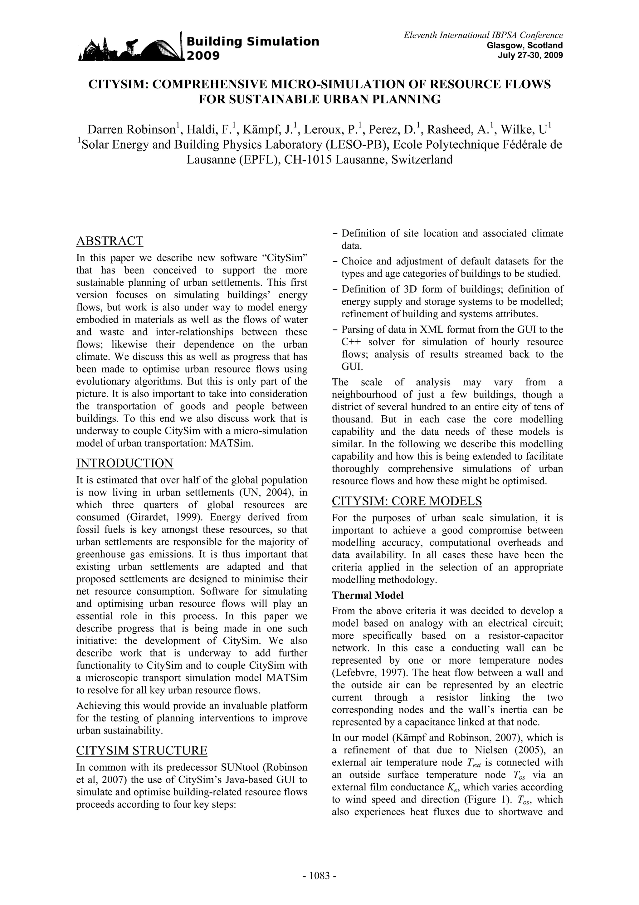 CitySim is micro-simulation software for comprehensively modeling and optimizing resource flows in urban planning. It simulates buildings' energy flows using a thermal circuit model and considers embodied energy and water/waste flows. CitySim couples with a transportation model to account for all key urban resource flows. This allows testing planning interventions to improve sustainability. Current work focuses on extending CitySim's modeling capabilities and optimizing urban resource flows using evolutionary algorithms.