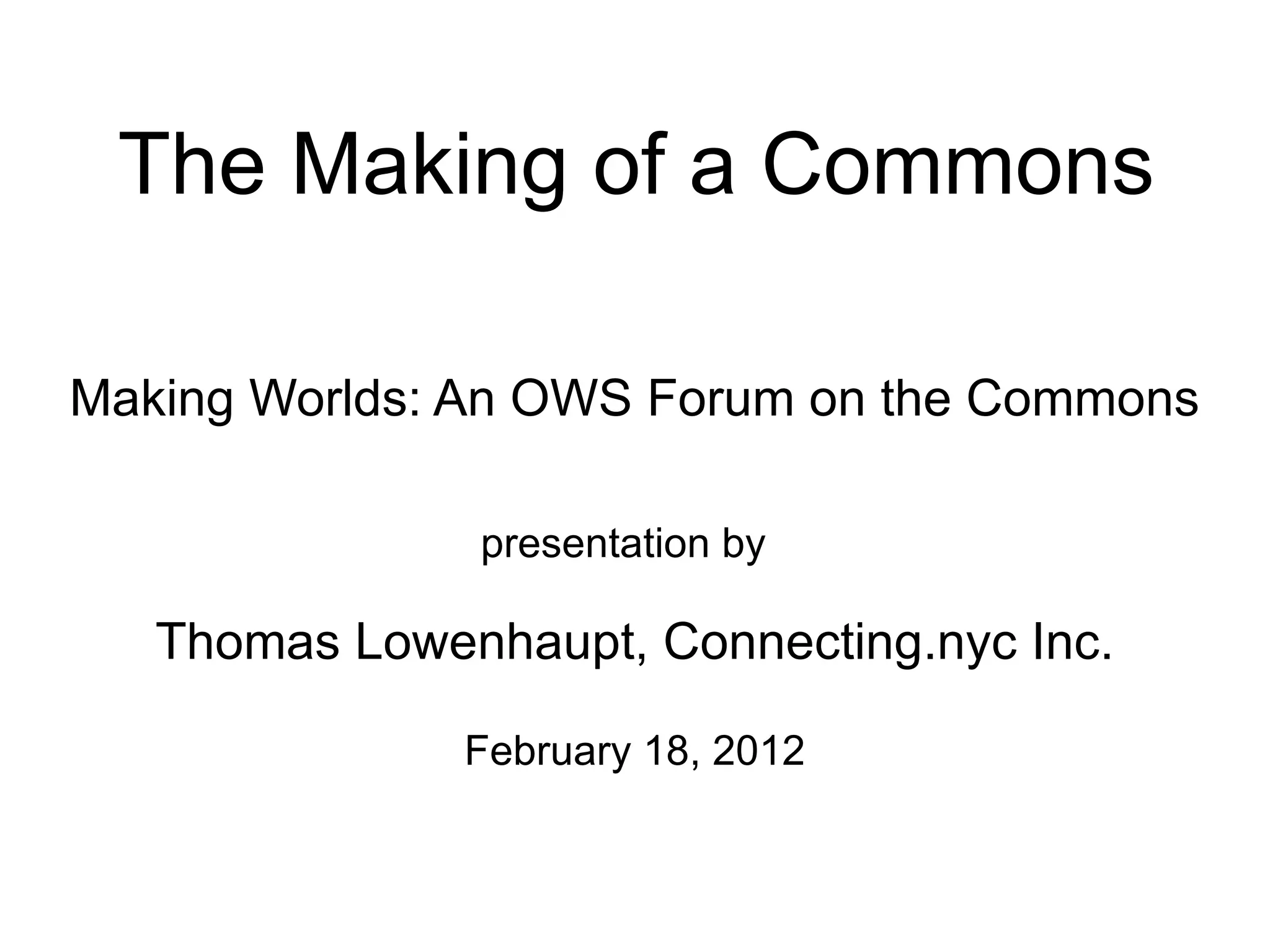 The presentation by Thomas Lowenhaupt on February 18, 2012, discusses the significance of top-level domains (TLDs) such as .nyc in enhancing urban networks and improving quality of life in cities. It highlights the role of local online resources in fostering community connectivity and explores the potential of civic networks to address neighborhood needs. The discussion acknowledges the evolution of digital networking and the importance of collaboration among communities to leverage technology effectively.