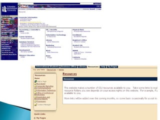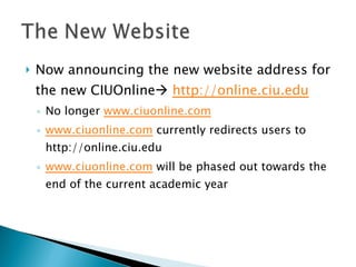 The document announces a forum to discuss the migration of websites from ciuonline.com and ciu.edu/ciunet to the new online.ciu.edu. It provides information on the new website address and login credentials. It also outlines the process of migrating department pages to the new site and the need for training content editors on the new site.