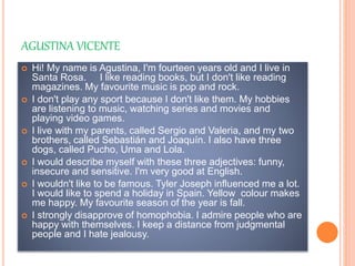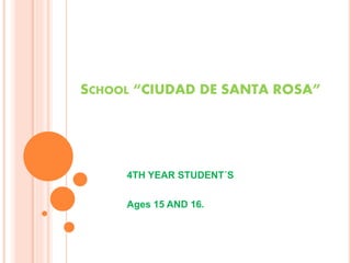 This document contains profiles of 15 students aged 14-16 years old from the school "Ciudad de Santa Rosa" in Argentina. Each student provides information about their name, age, likes/dislikes related to music, sports, hobbies and family as well as personal attributes and aspirations.
