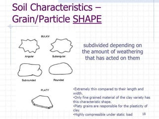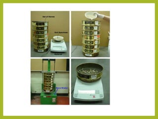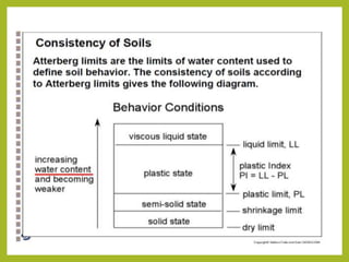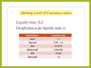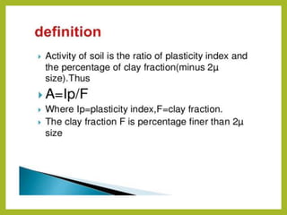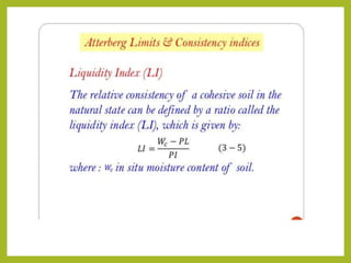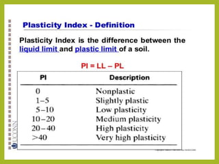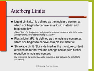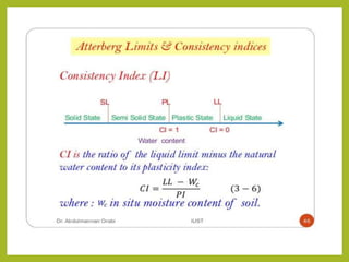 This document discusses soil mechanics and properties. It covers the origin and classification of soils, particle size distribution, indices like void ratio and specific gravity. Engineering properties like permeability, compressibility and shear strength are also mentioned. Different tests for soil classification like sieve analysis, hydrometer analysis, and Atterberg limits are described. Concepts of three phase diagrams, void ratio, porosity, degree of saturation and their relationships are explained. Engineering applications of void ratio are provided.