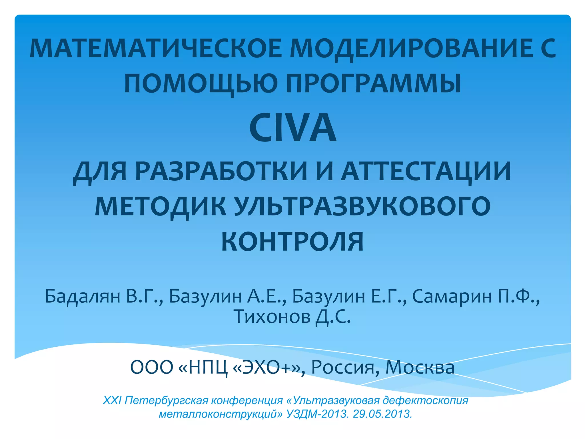 Документ описывает использование программного обеспечения CIVA для математического моделирования и аттестации методик ультразвукового контроля. Рассматриваются подходы к аттестации, методы моделирования и основные требования к образцам, а также важные параметры контроля, влияющие на эффективность выявления дефектов. Подчеркивается необходимость создания надежных математических моделей на основе физических принципов для повышения достоверности и точности контроля.