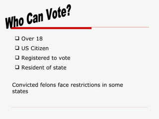 The document discusses the history and process of voting and elections in the United States. It covers who could vote in the past compared to modern day, the voter registration process, election day procedures, types of elections, and the electoral college system. It also discusses campaign strategies such as getting messages out through advertising, direct mail, and personal appearances.