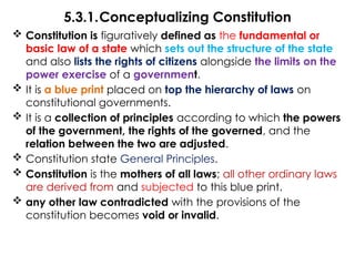 Chapter five discusses the concept of constitutions, their features, purposes, and classifications. It highlights the importance of constitutionalism and the historical constitutional experience of Ethiopia, from pre-1931 documents to modern constitutions. The document outlines the evolution of Ethiopia's constitutional framework, emphasizing key revisions and their impacts on governance and citizen rights.
