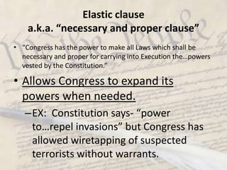 The document outlines key principles of the U.S. Constitution, emphasizing concepts such as popular sovereignty, separation of powers, limited government, checks and balances, and federalism. It details the roles and powers of each branch of government, the process of how a bill becomes law, and the amendment process, including significant amendments that have shaped civil rights and voting. Additionally, it discusses the Bill of Rights and various constitutional clauses, highlighting their importance in protecting individual freedoms.